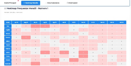 • Heatmap mensile: una mappa di calore che mostra mese per mese e ruota per ruota dove il numero è uscito di più negli ultimi 12 mesi